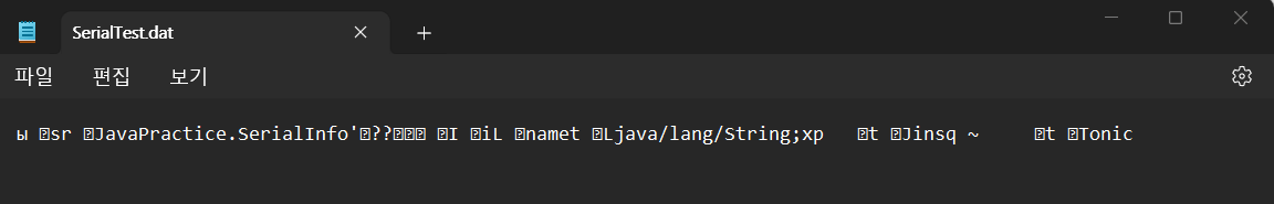 먼저 파일을 읽어올 FileInputStream 클래스 변수 fis를 선언해 아까 저장한 "SerialTest.dat"을 불러온다.