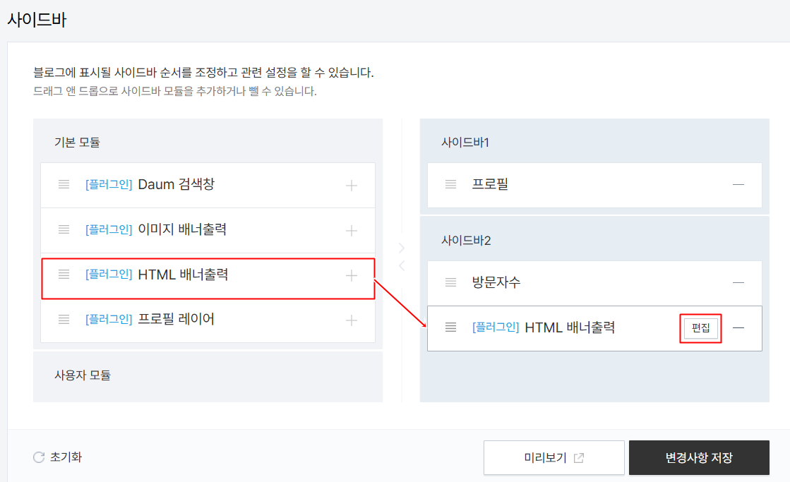 이를 광고를 배치할 사이드바 위치를 지정해 오른쪽으로 드래그 앤 드롭한다.