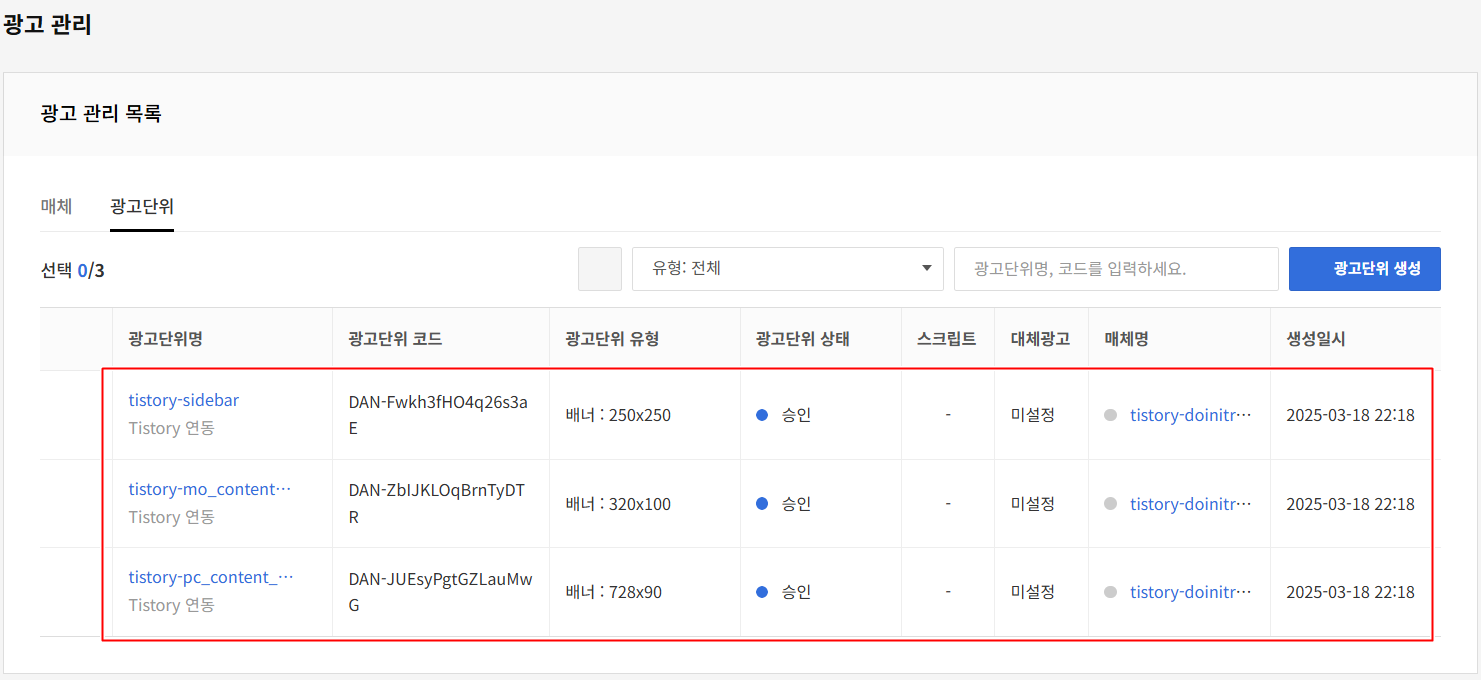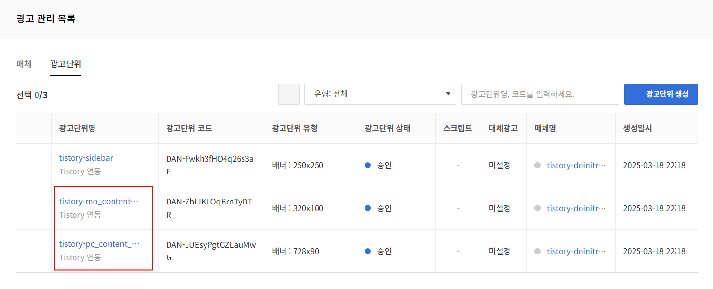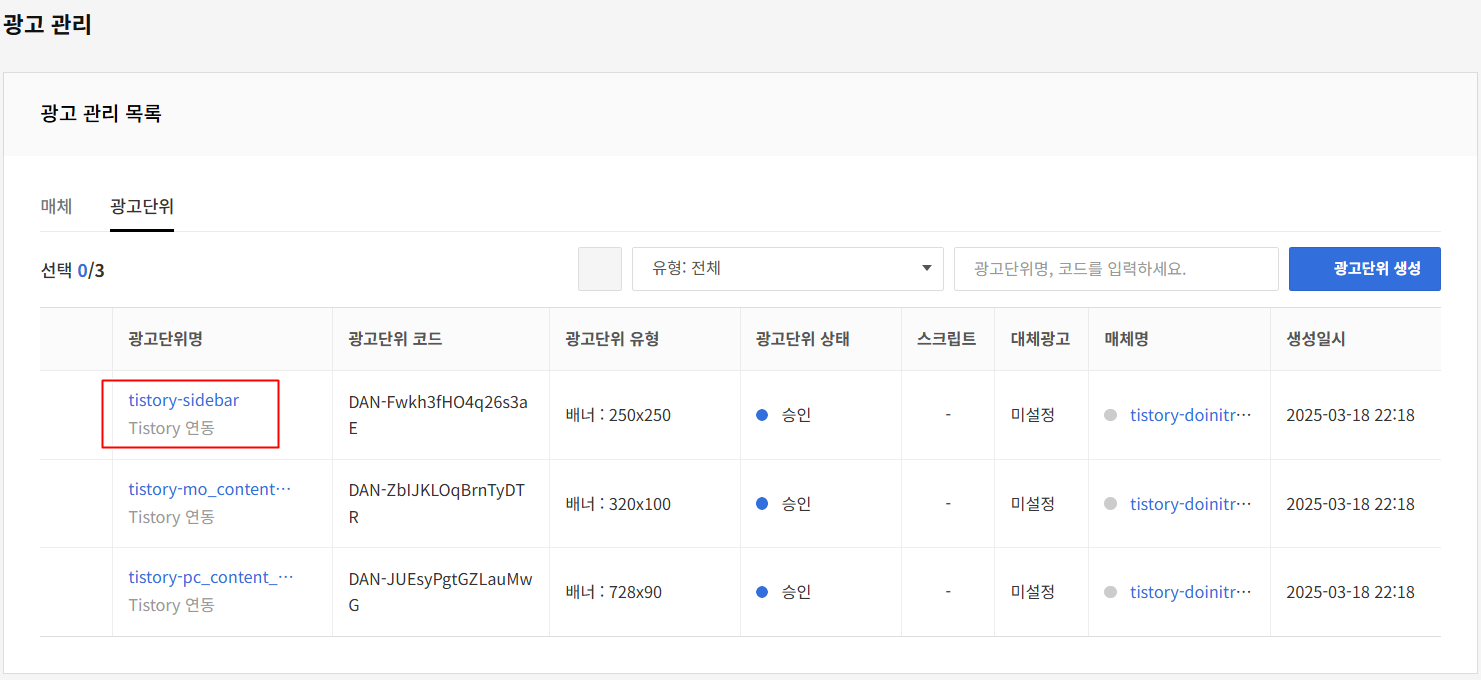 카카오 애드핏 기본 연동 시 총 3개의 광고단위가 기본값으로 생성되는데
