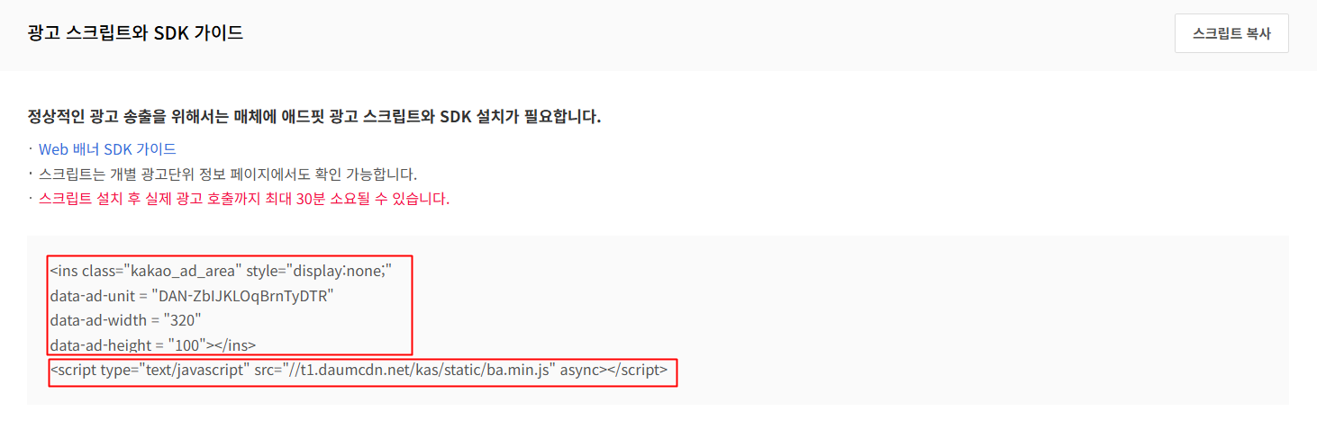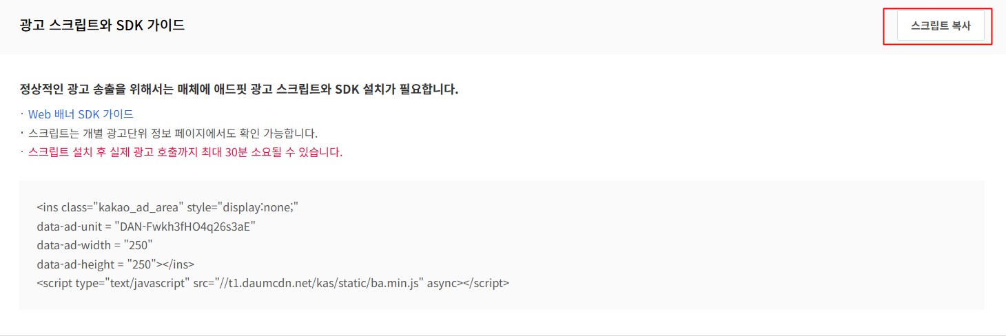 이 스크립트 요소는 최초 1회만 입력하면 이후 추가 광고단위를 생성해도 입력할 필요가 없다.