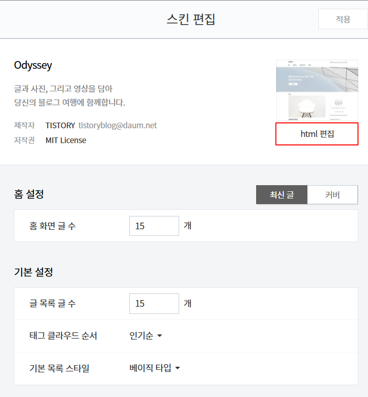 이제 html 코드를 수정해야 한다. 블로그 관리 > 스킨 편집 > html 편집으로 들어간다.