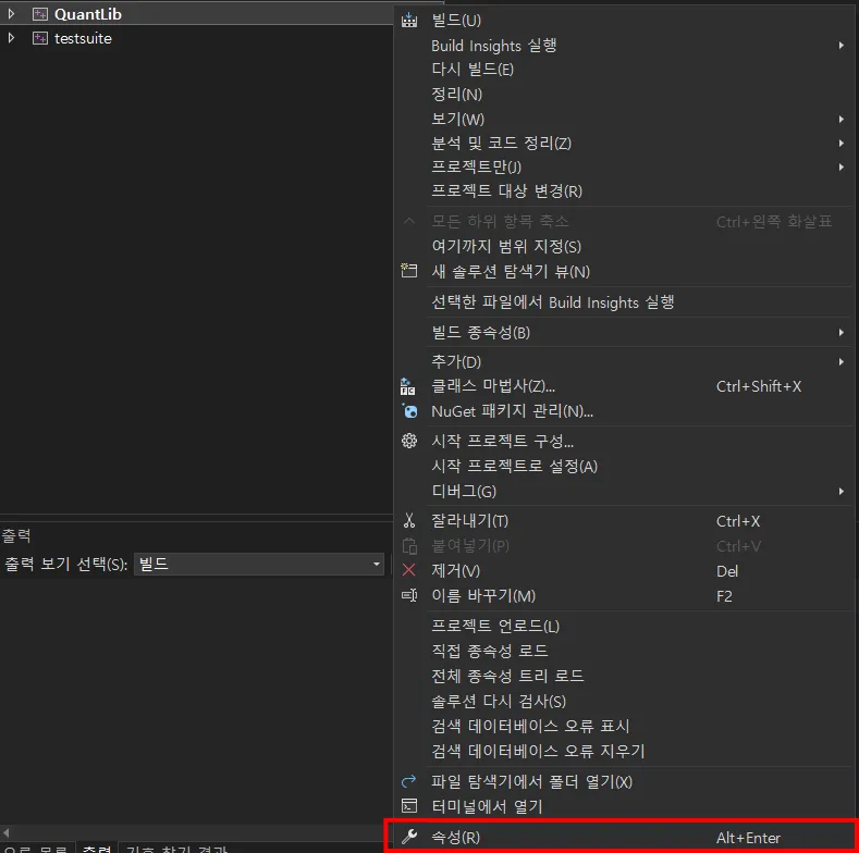 2. 좌측의 솔루션 탐색기에서 QuantLib 우클릭 > 속성 진입