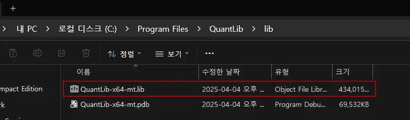 7. 빌드 결과 확인 : 기존 QuantLib의 "루트 디렉토리/lib" 폴더에서 확인