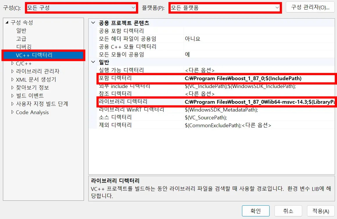 포함 디렉터리 : ‘C:\Program Files\boost_1_87_0’ 추가