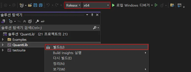 6. 구성 환경 변경 확인 후 솔루션 QuantLib 우클릭 > 빌드 실행