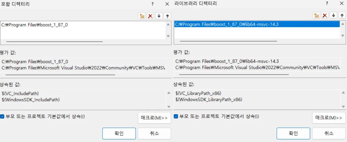 라이브러리 디렉터리 : ‘C:\Program Files\boost_1_87_0\lib64-msvc-14.3’ 추가