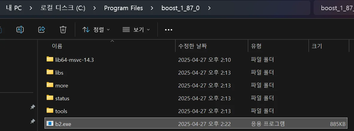 1. 위 사이트에서 boost_1_87_0-msvc-14.x-"bit".exe 중 아무거나 다운로드 받는다.