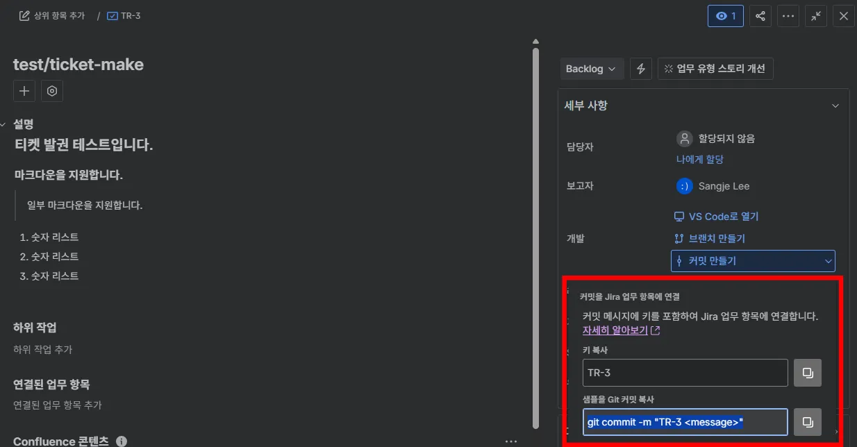해당 이슈의 이슈 키와, 연결하기 위한 커밋 예시를 볼 수 있다.