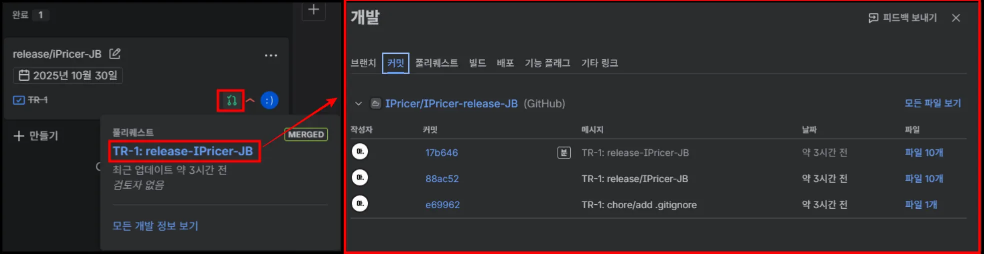 칸반 보드 등 대시보드의 이슈의 아래 버튼을 통해 이슈 키를 링킹한 Github 브랜치와 PR, 커밋 등을 확인할 수 있다.
