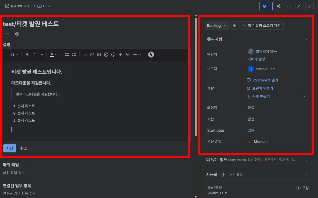 - 설명: 작업 간 할 일이나, 그 밖의 이슈 기재(마크다운 문법 지원)