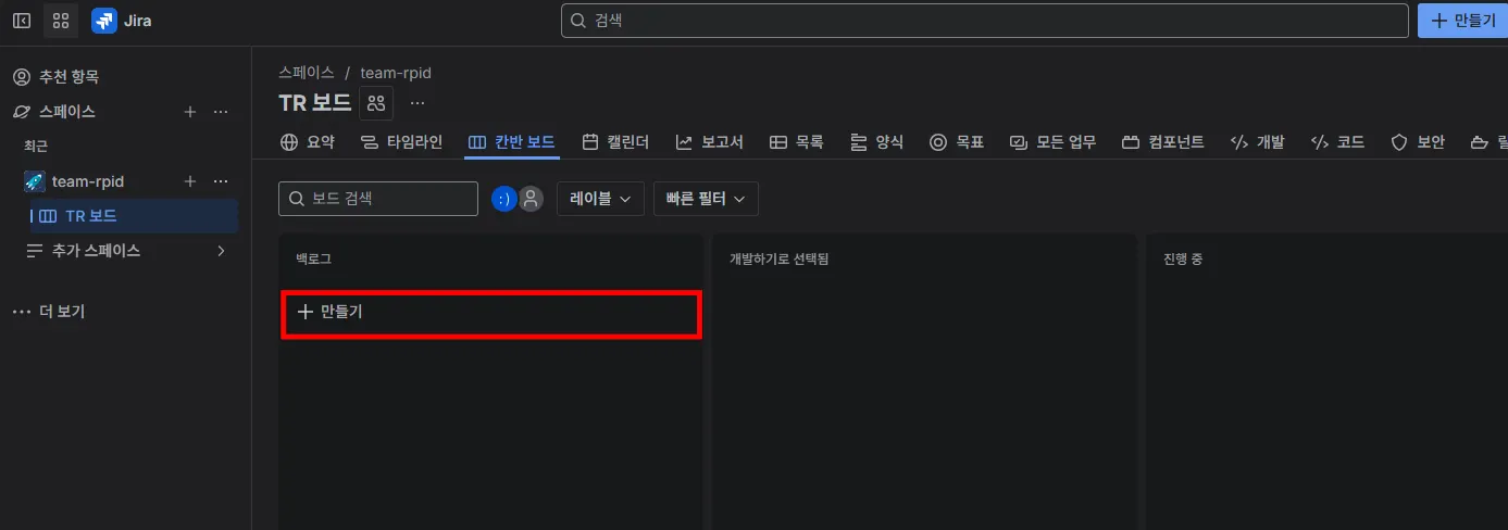 Jira 팀 스페이스 > 칸반 보드 > 백로그 > "만들기" 버튼을 누른다.